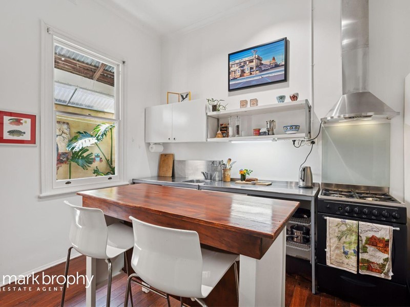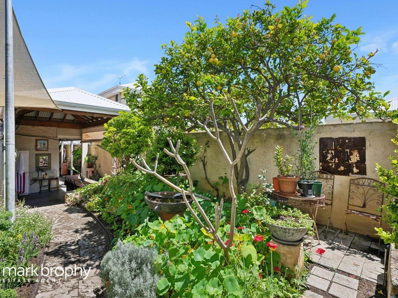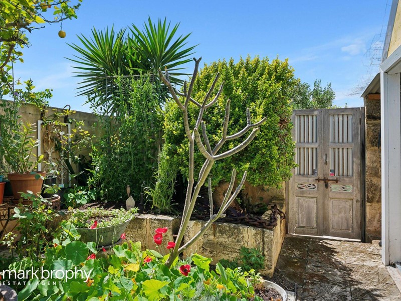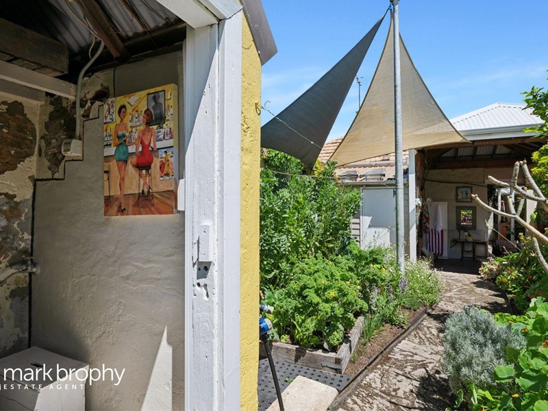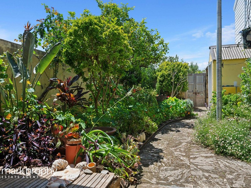 The rear garden is gorgeous with plenty of colour, succulents, mature plants and super productive vegie garden with an assortment of organic food including two varieties of kale, broad beans, spinach and lettuce. A very private, walled, suntrap with access to the rear via a Right of Carriageway. There is also a brick and iron 2nd toilet within the garden.