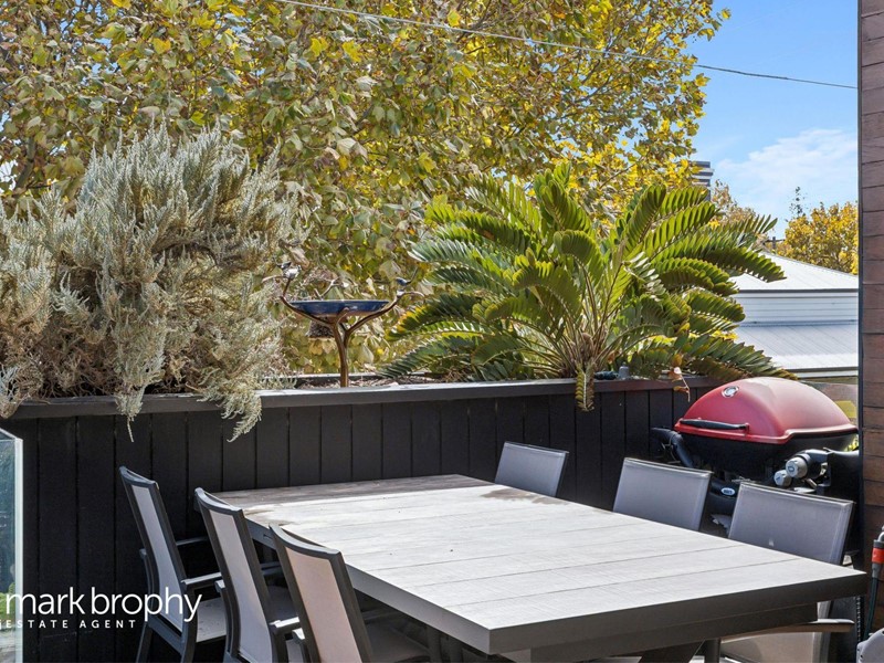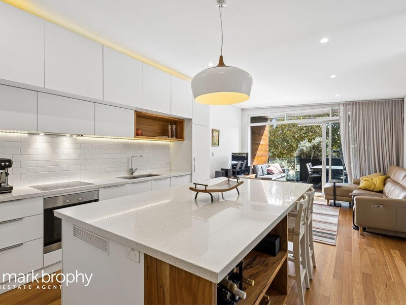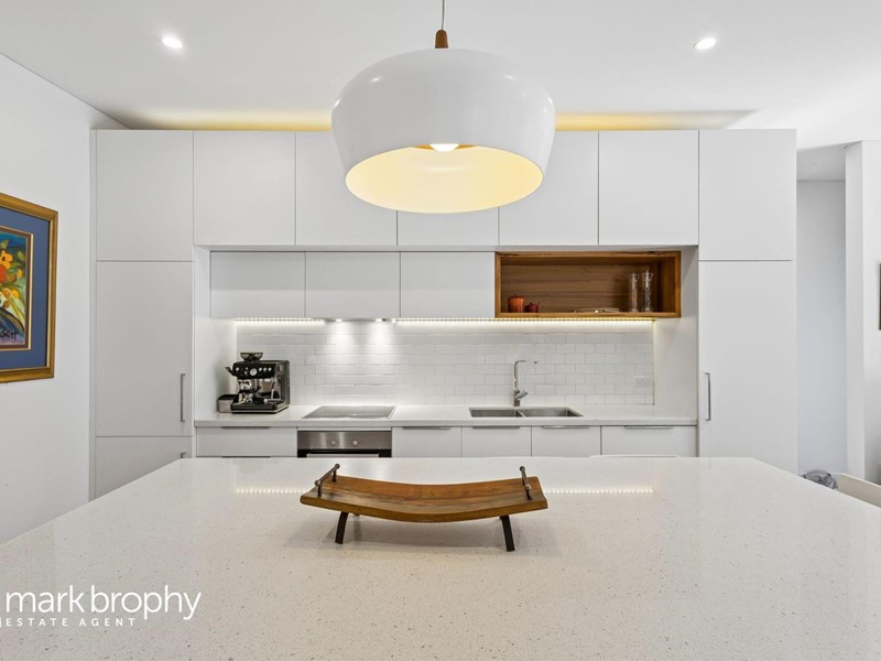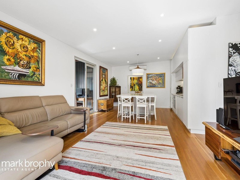 A carefully considered design with spotted gum cladding, blond wood flooring and chef's kitchen with integrated appliances. The living zones are seamless with giant glass sliders providing a wonderful spacious area with small potted garden giving further privacy to the northern boundary.
